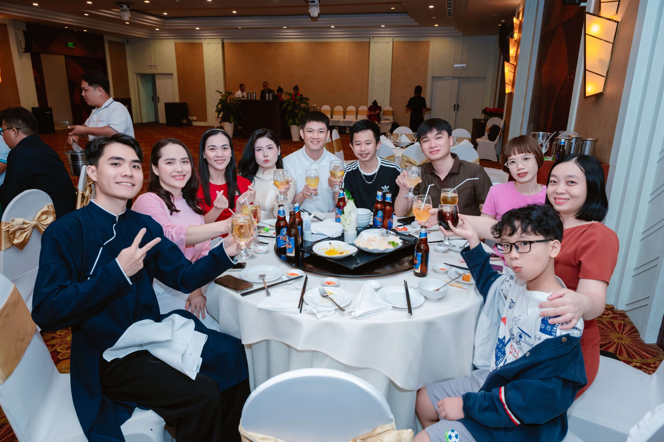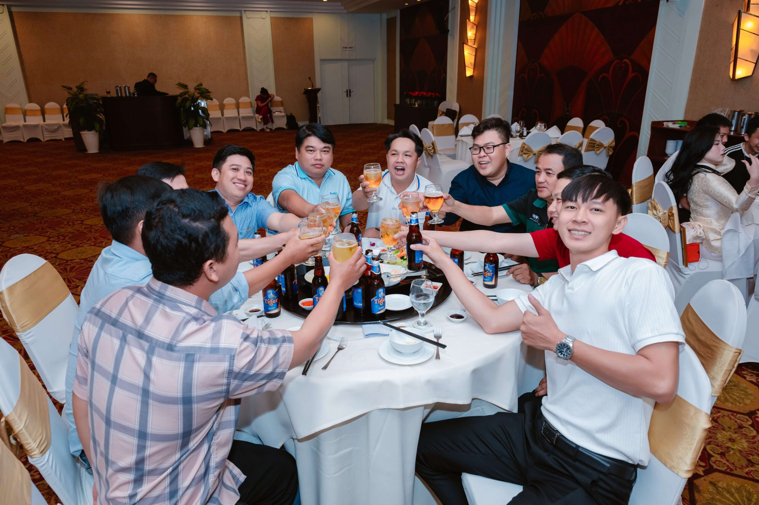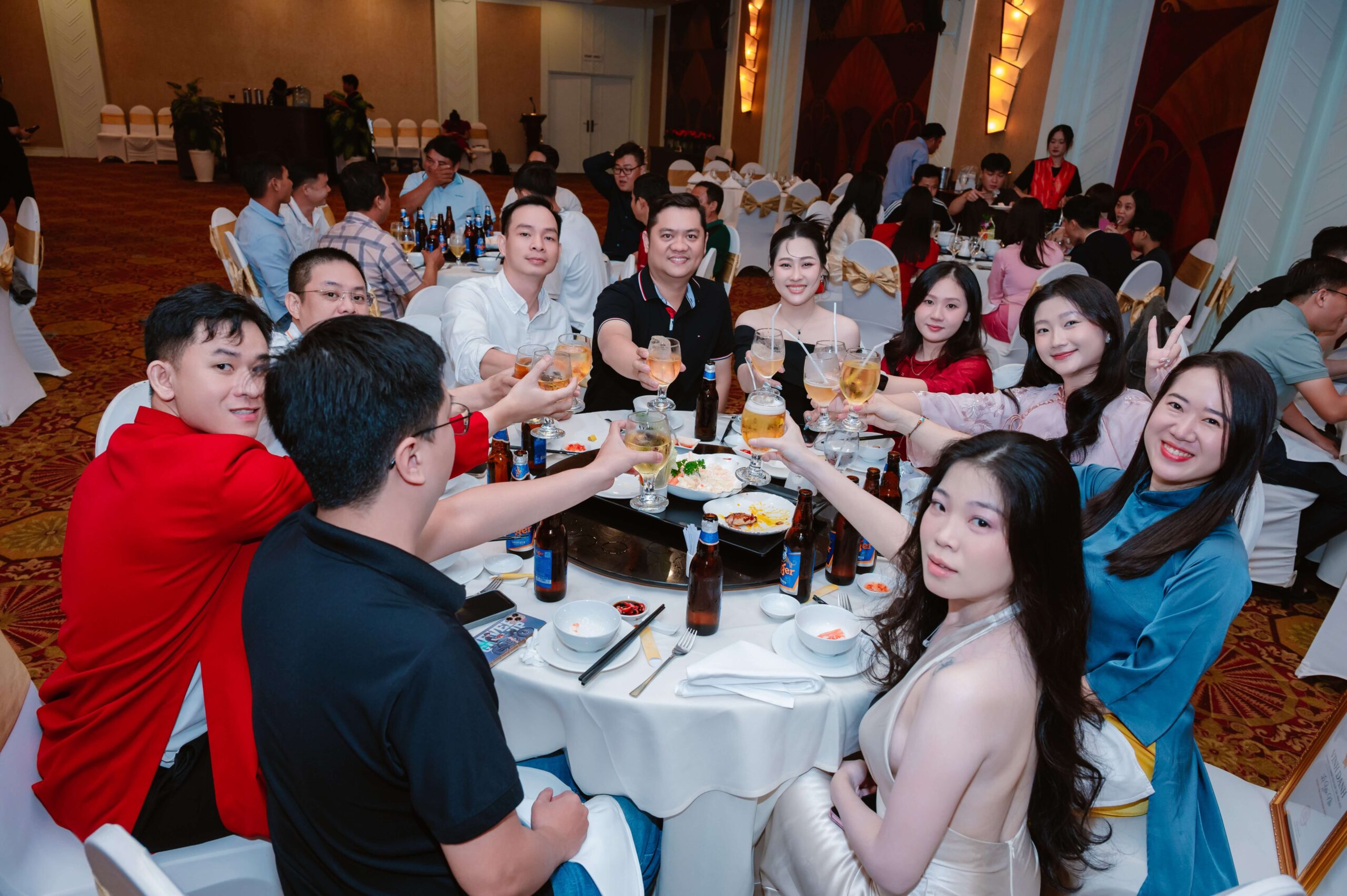 Sau phần vinh danh, Ban Lãnh Đạo thực hiện nghi thức khai tiệc trong sự hưởng ứng của toàn thể hội trường. Khoảnh khắc này thể hiện sự thống nhất về mục tiêu và tinh thần đồng hành giữa lãnh đạo và nhân viên, đánh dấu sự khởi đầu cho hành trình phát triển tiếp theo.