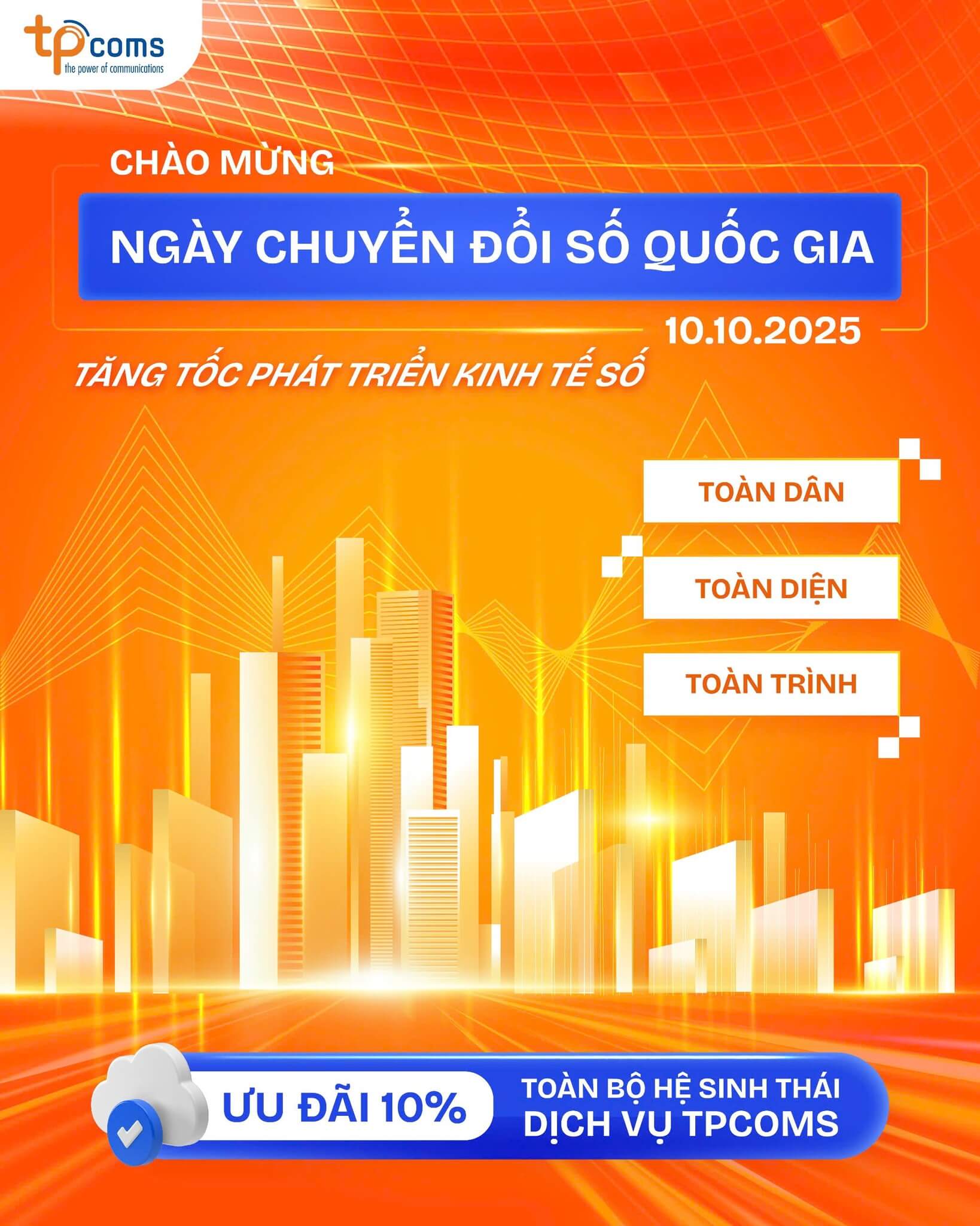 Chào mừng Ngày Chuyển đổi số Quốc gia 10/10/2025, hưởng ứng chủ đề “Chuyển đổi số toàn dân, toàn diện, toàn trình để tăng tốc, bứt phá phát triển kinh tế số”, TPCOMS triển khai chương trình ưu đãi đặc biệt – giảm 10% dành riêng cho khách hàng đăng ký mới các dịch vụ trong hệ sinh thái sản phẩm số toàn diện.